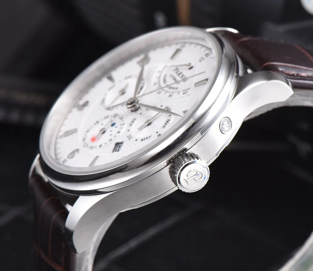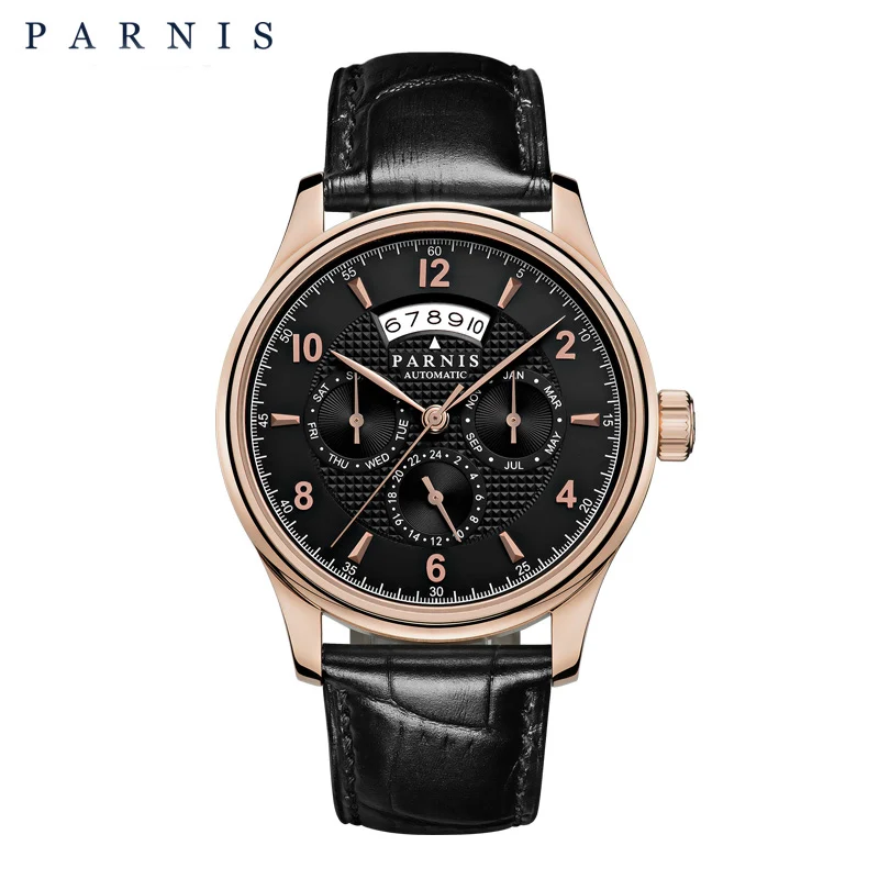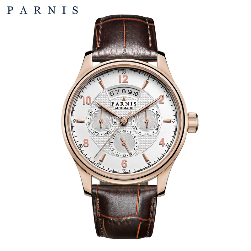Best Quality Parnis 42mm Gold Case Mechanical Automatic Men Watch Moon Phase Power Reserve Men's Watches Luxury
